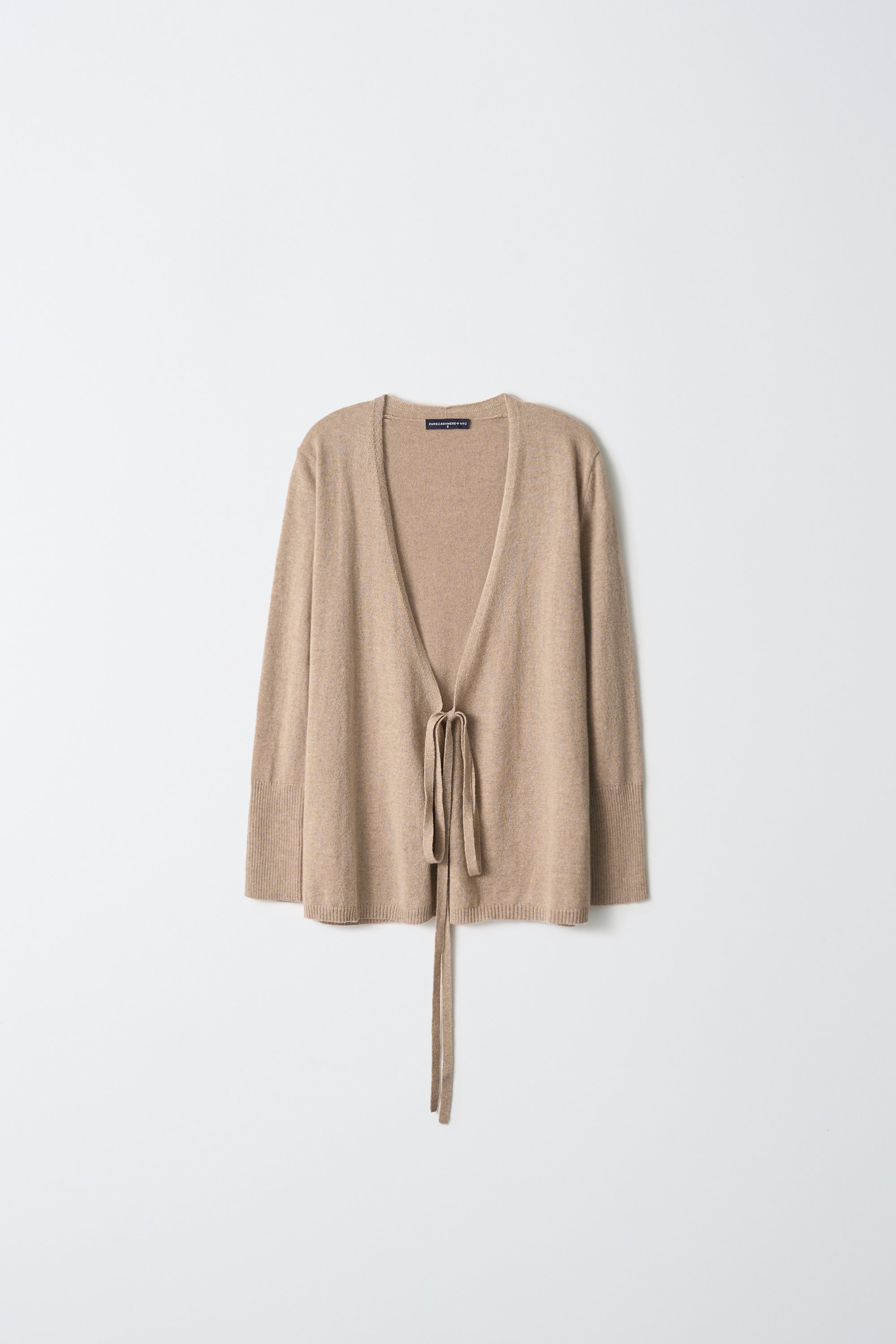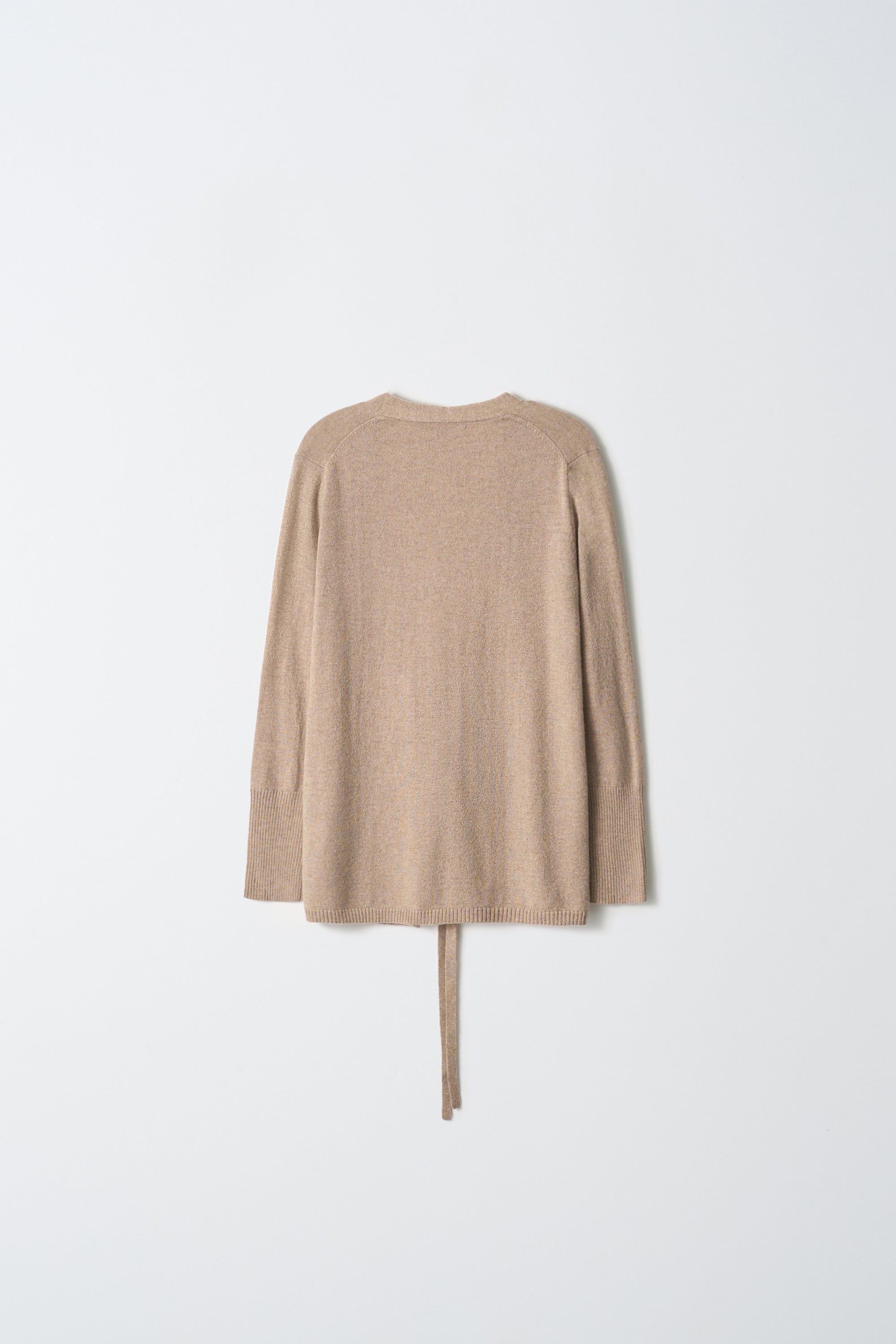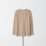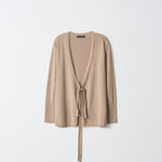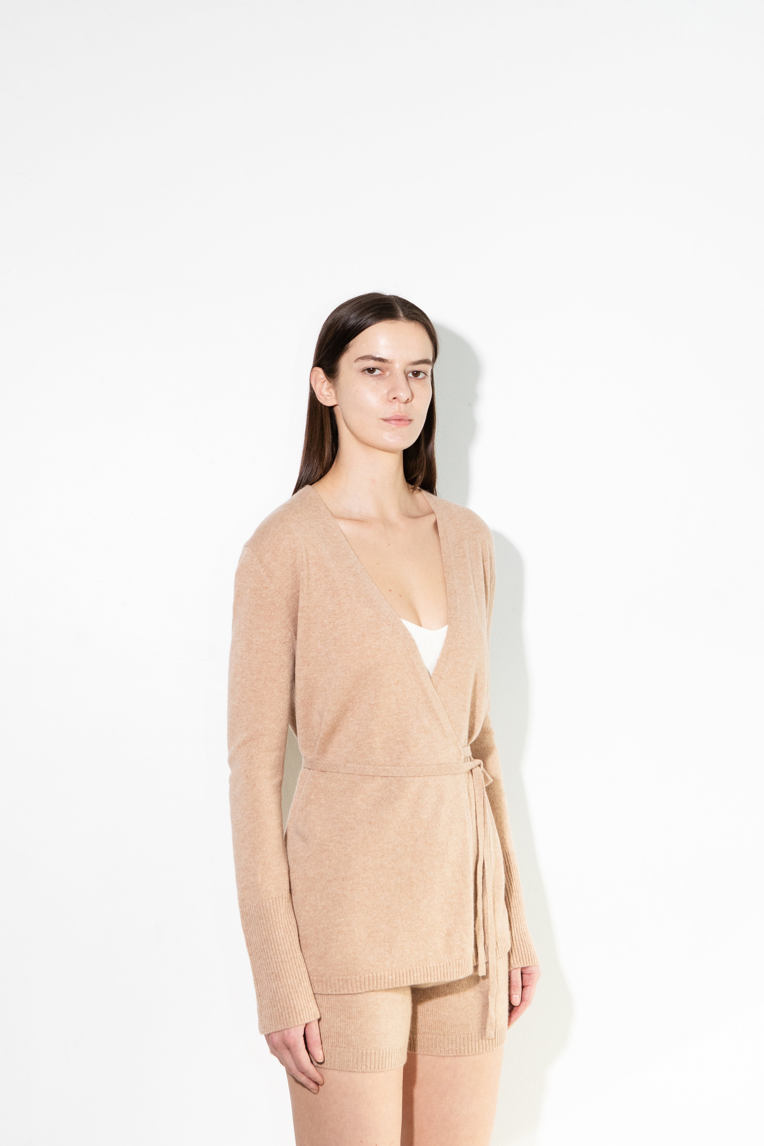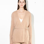 100% Mongolian Cashmere wrap cardigan presents a feminine mood with deep V-neck and wrap around self tie fastening at waist. The ties can be adjusted for a personalized fit.