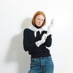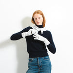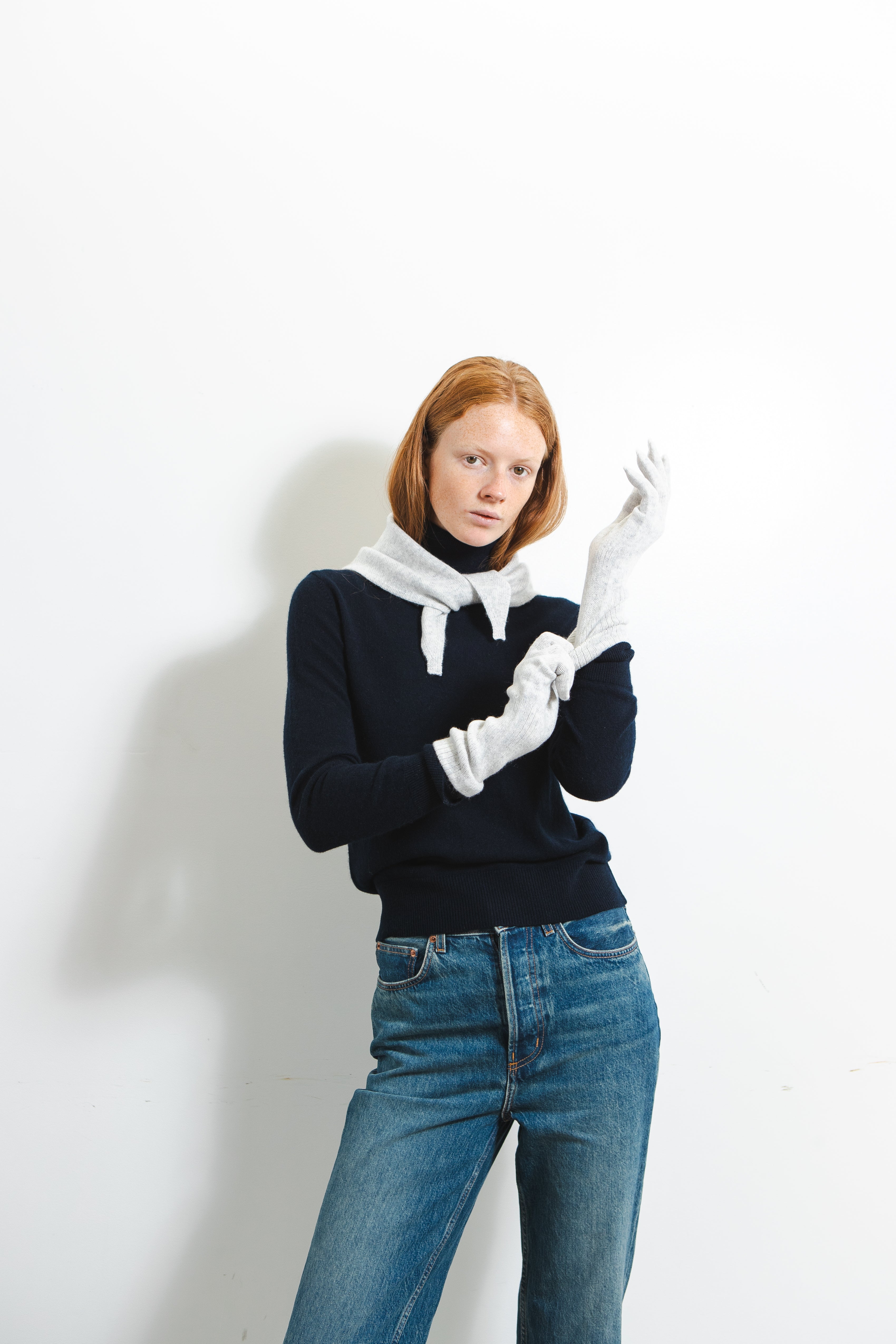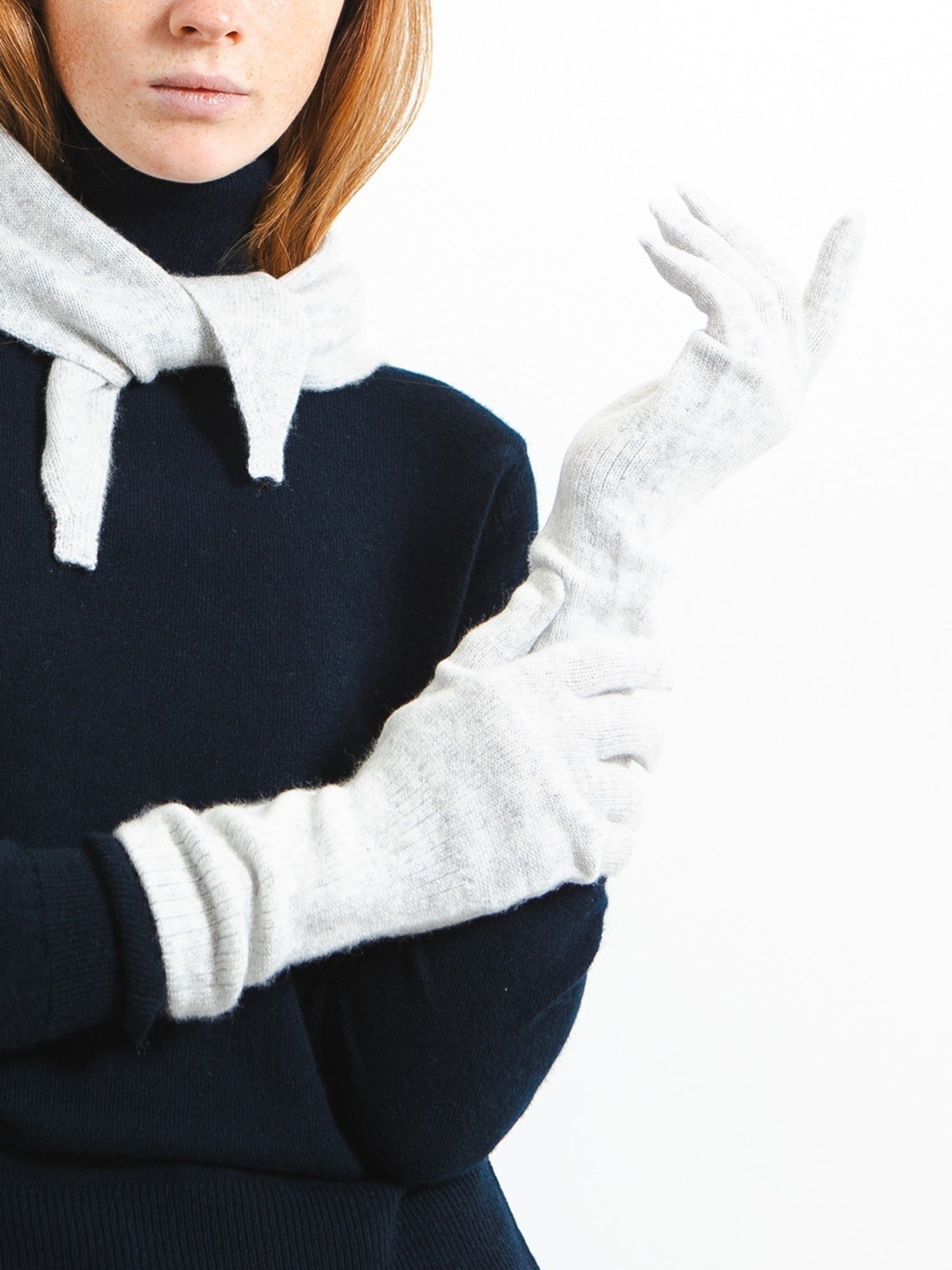 Crafted from ultra-soft pure cashmere, these gloves feature a subtle ribbed texture and an extended wrist design for added warmth and elegance. The refined silhouette ensures a snug, comfortable fit while elevating any cold-weather ensemble with a touch of understated luxury.