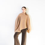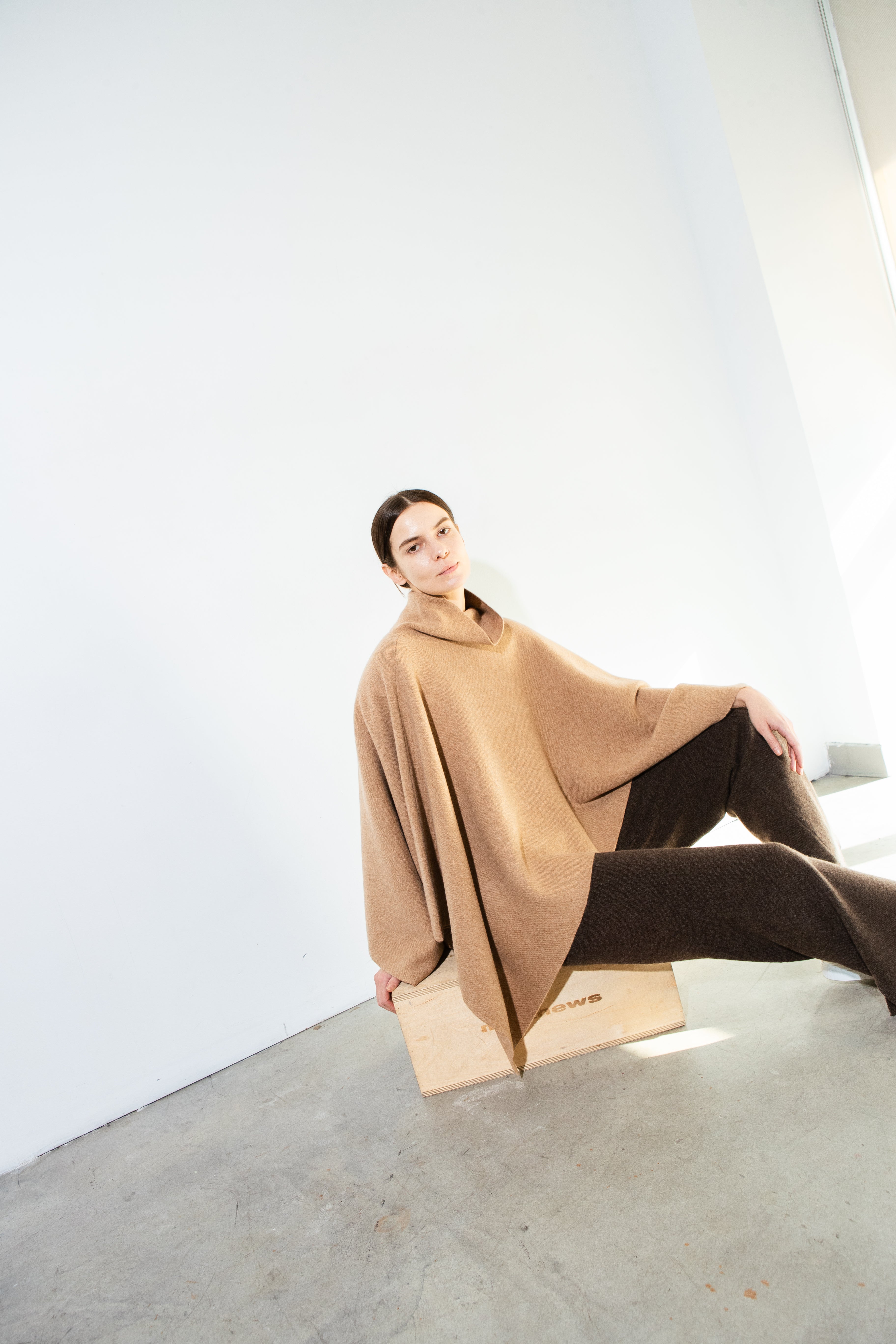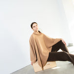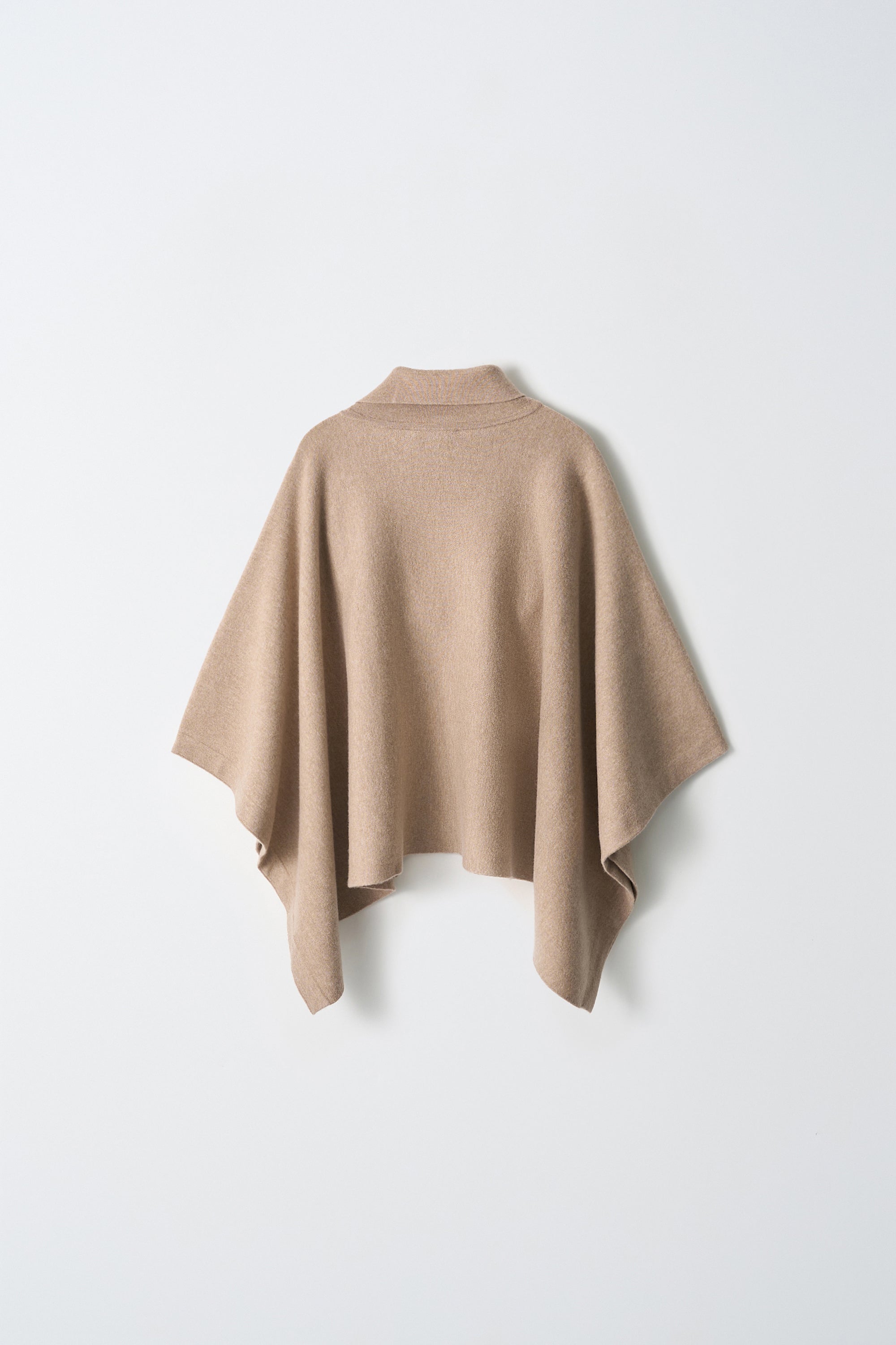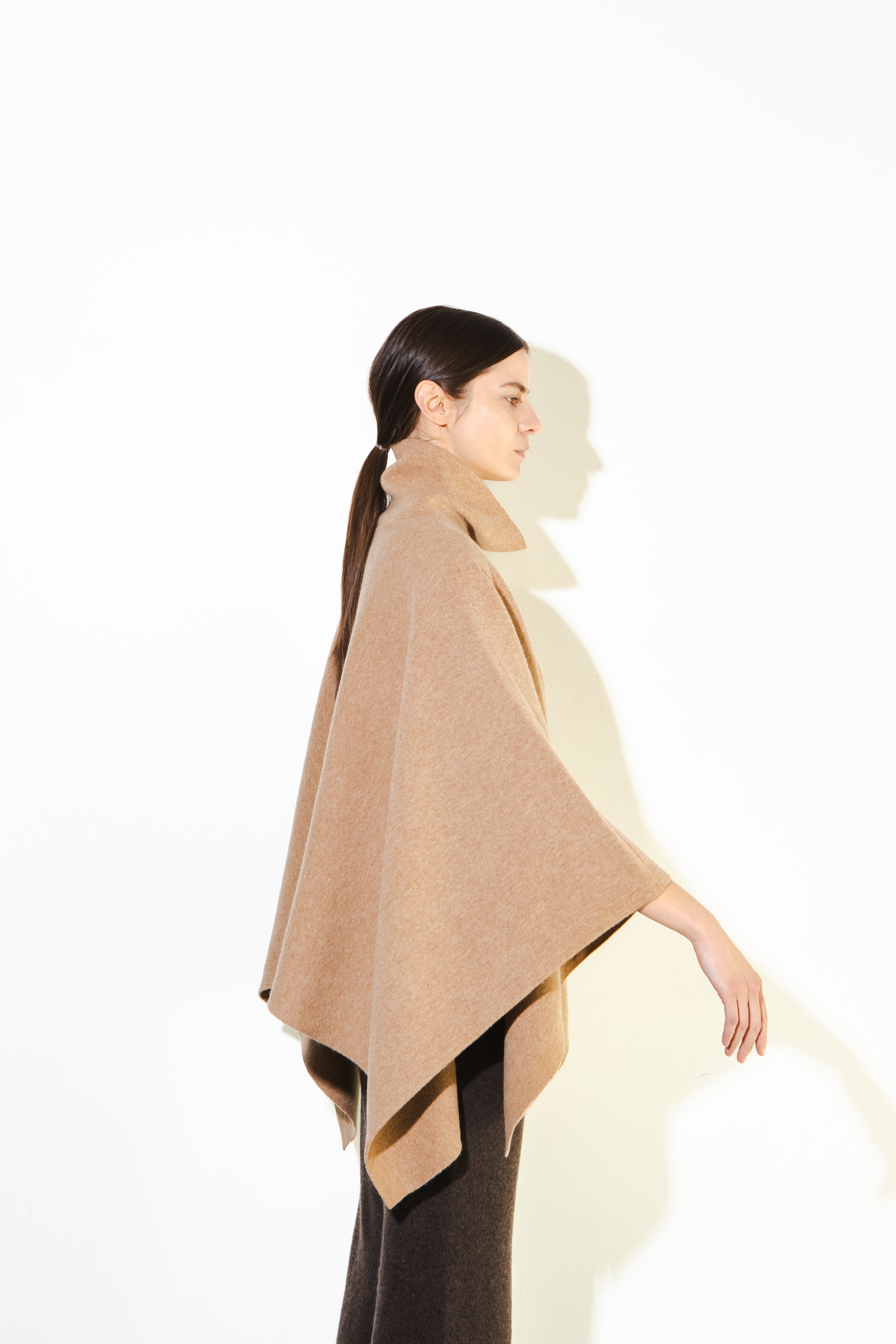 Made from a luxurious blend of 90% wool and 10% cashmere, this high-neck poncho offers a perfect balance of warmth and sophistication. The turtleneck design and substantial weight allow it to be worn as an outer layer, while its distinctive silhouette adds a unique, statement-making touch. A rare and timeless piece that elevates any cold-weather look.
