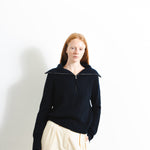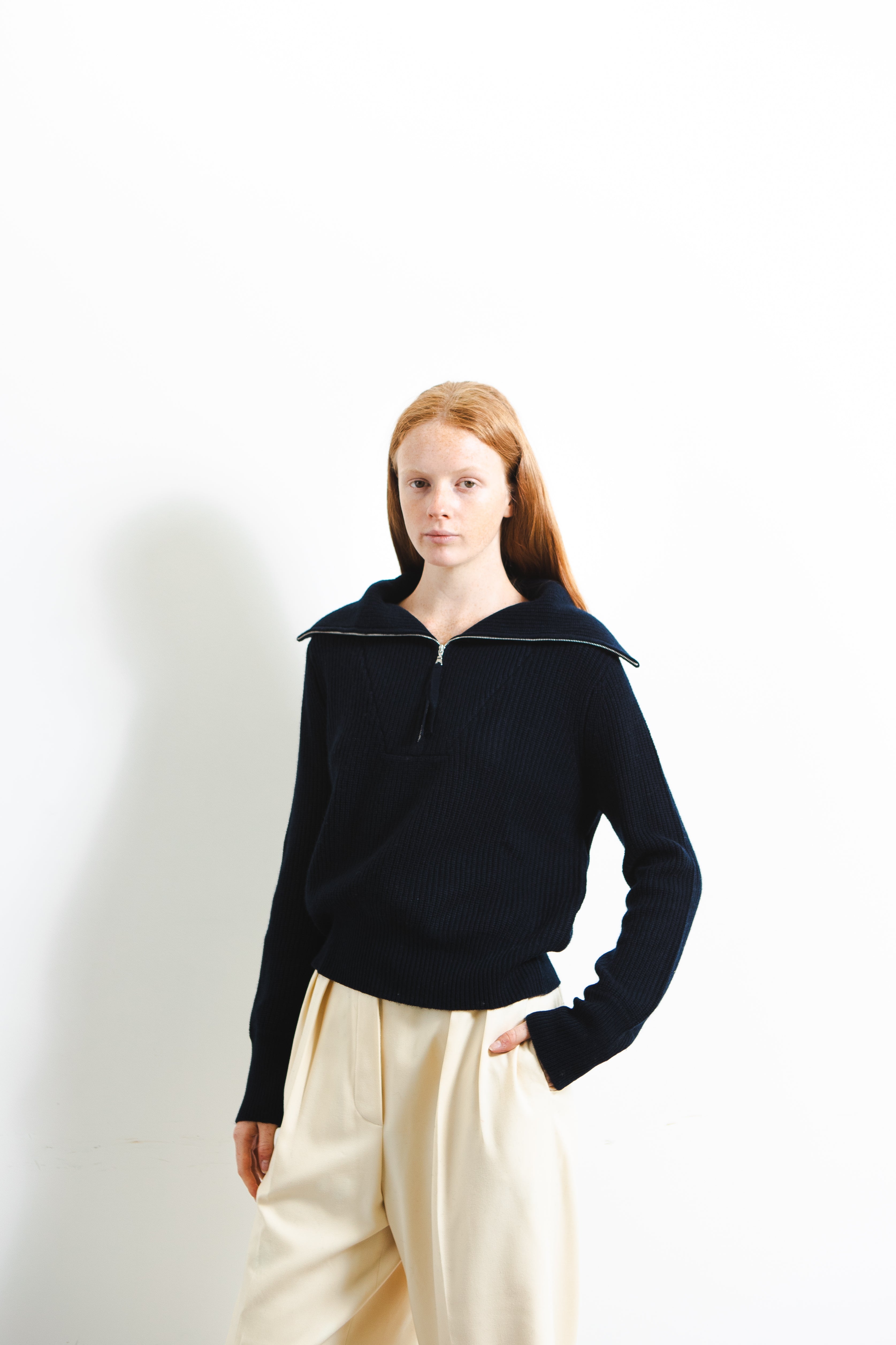 Crafted from a luxurious blend of 90% wool and 10% cashmere, this ribbed half-zip pullover combines warmth, softness, and modern ease. The textured rib knit offers a naturally flattering fit with subtle stretch, while the half-zip neckline allows versatile styling—from a cozy high neck to a relaxed open collar. Perfect for layering or wearing on its own for an effortlessly polished look.