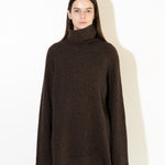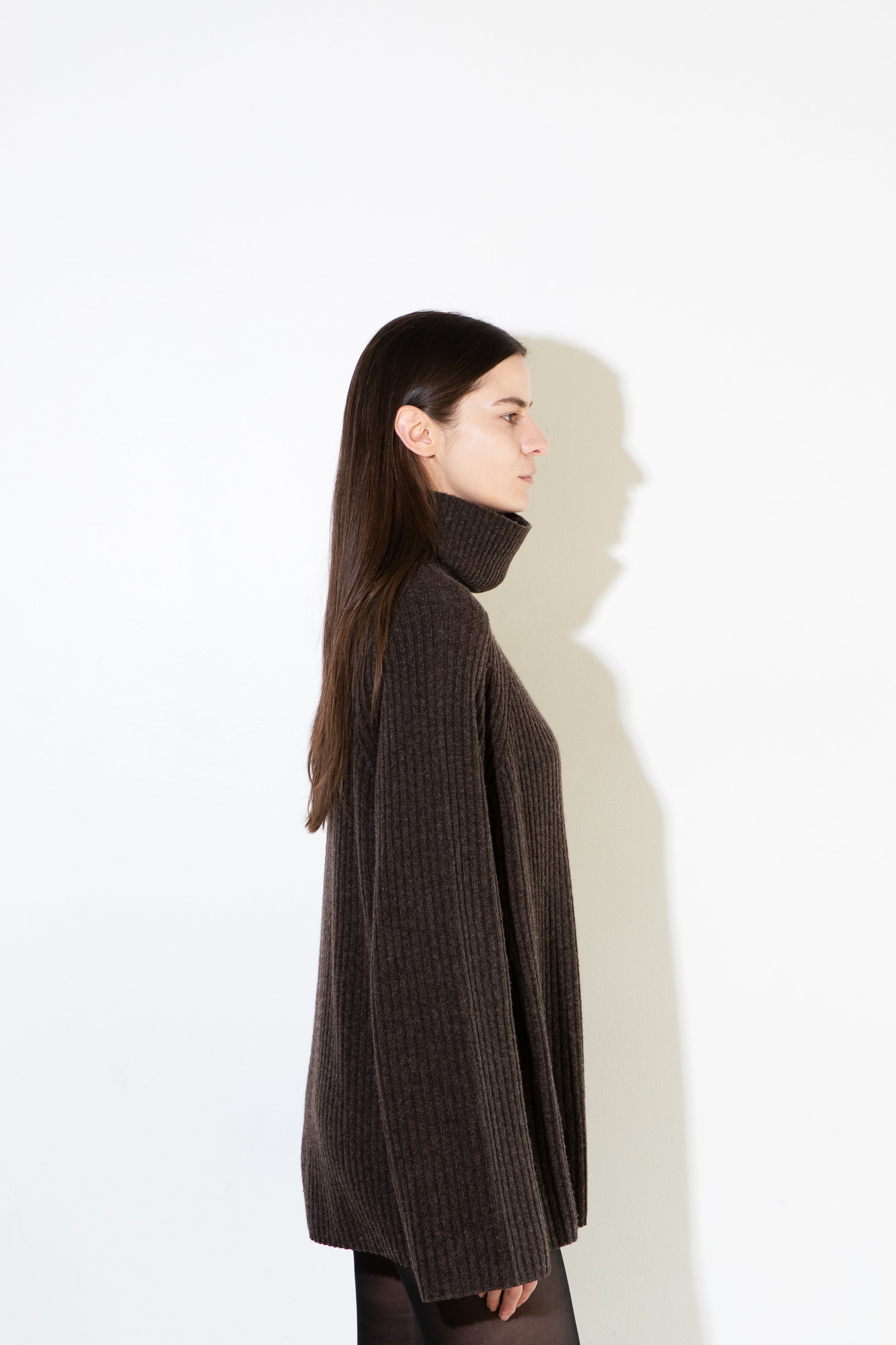 Knitted from a luxurious blend of 90% wool and 10% cashmere, this ribbed turtleneck sweater offers a perfect balance of warmth, softness, and structure. Designed in a relaxed, elongated silhouette, it drapes effortlessly for a modern, laid-back look — versatile enough to be worn as a cozy sweater or styled as a sweater dress.