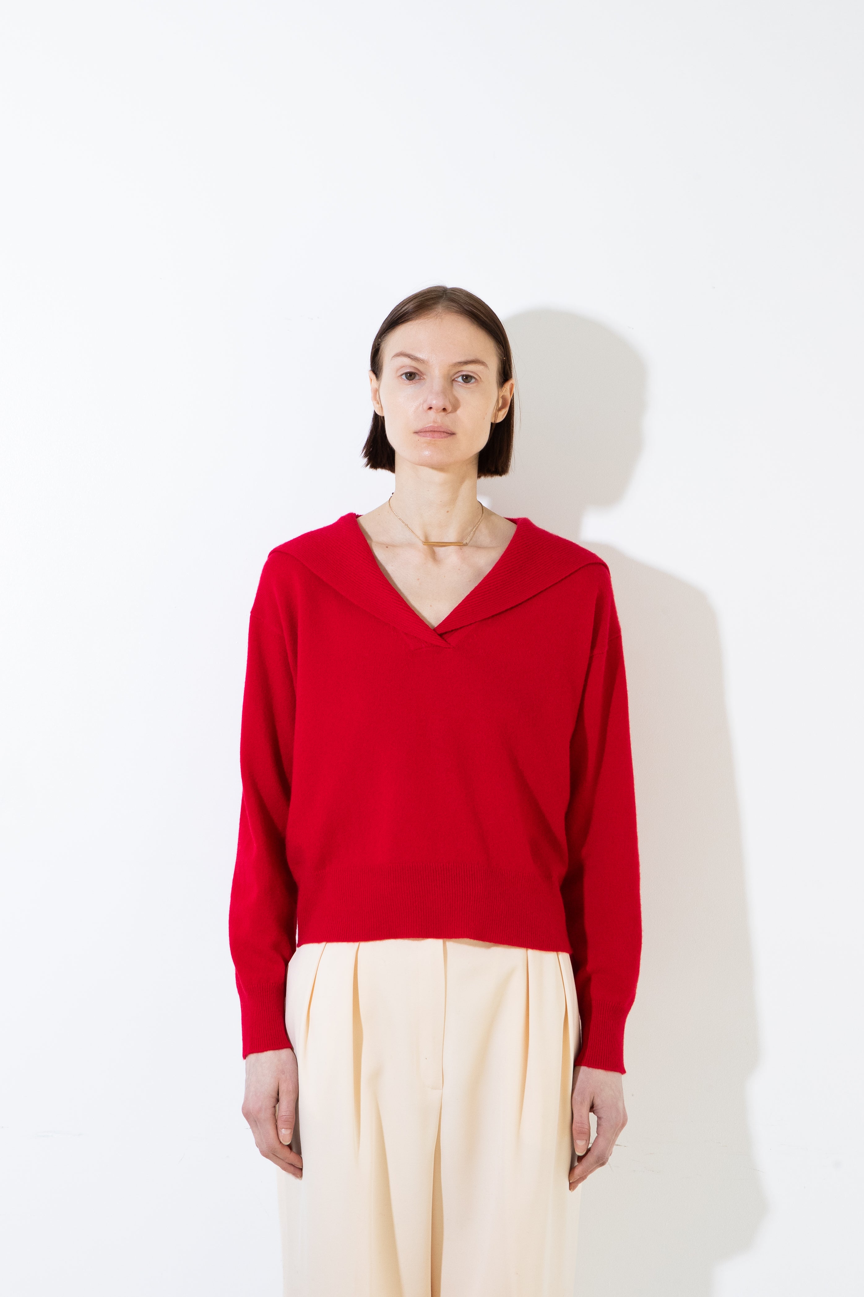 A refined take on a classic silhouette. Crafted from pure cashmere, this sailor-collar top combines timeless charm with a modern sensibility. The soft, lightweight knit drapes beautifully over the body, while the distinctive collar detail adds a subtle statement of sophistication. Perfect for effortless layering across seasons.