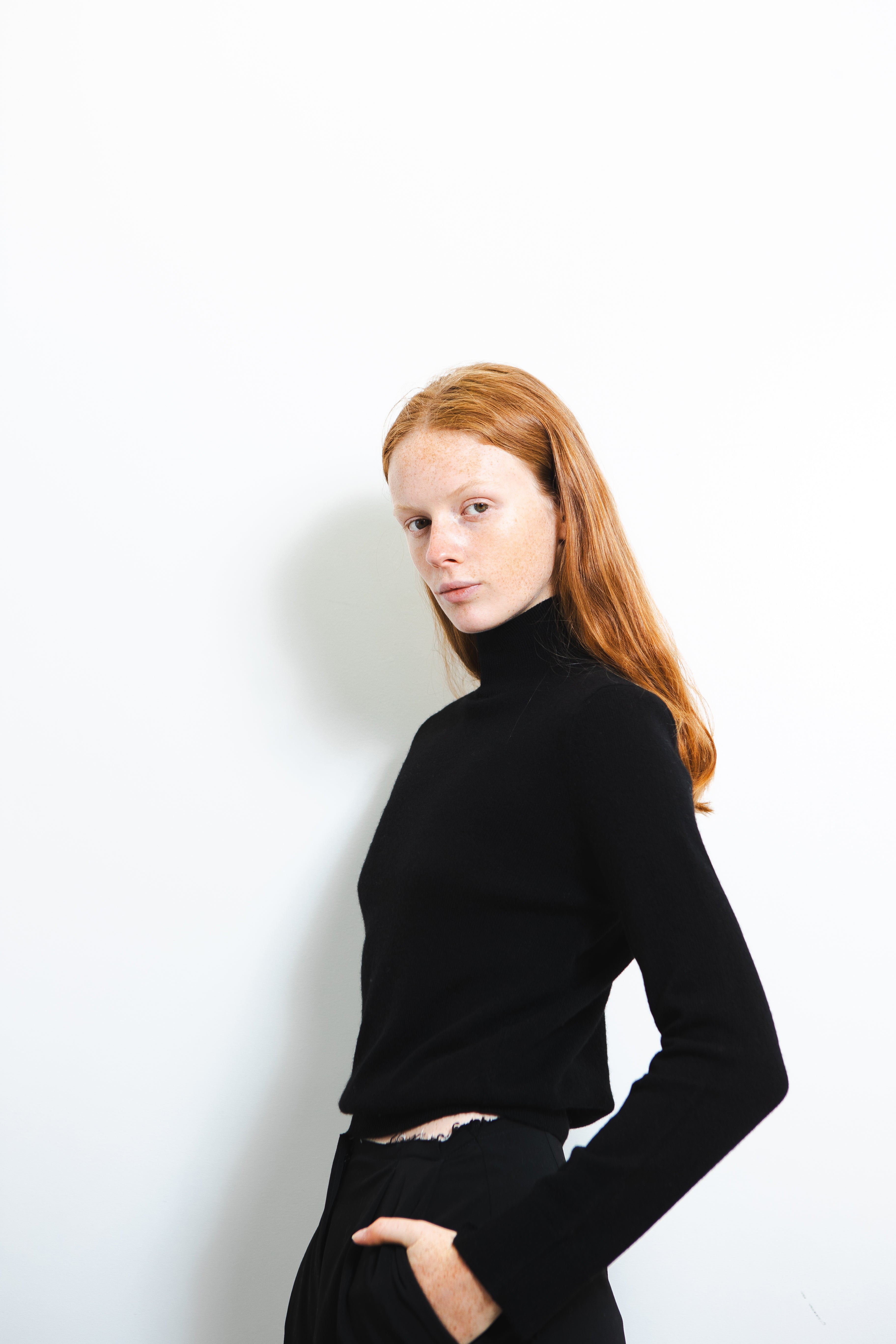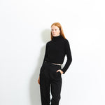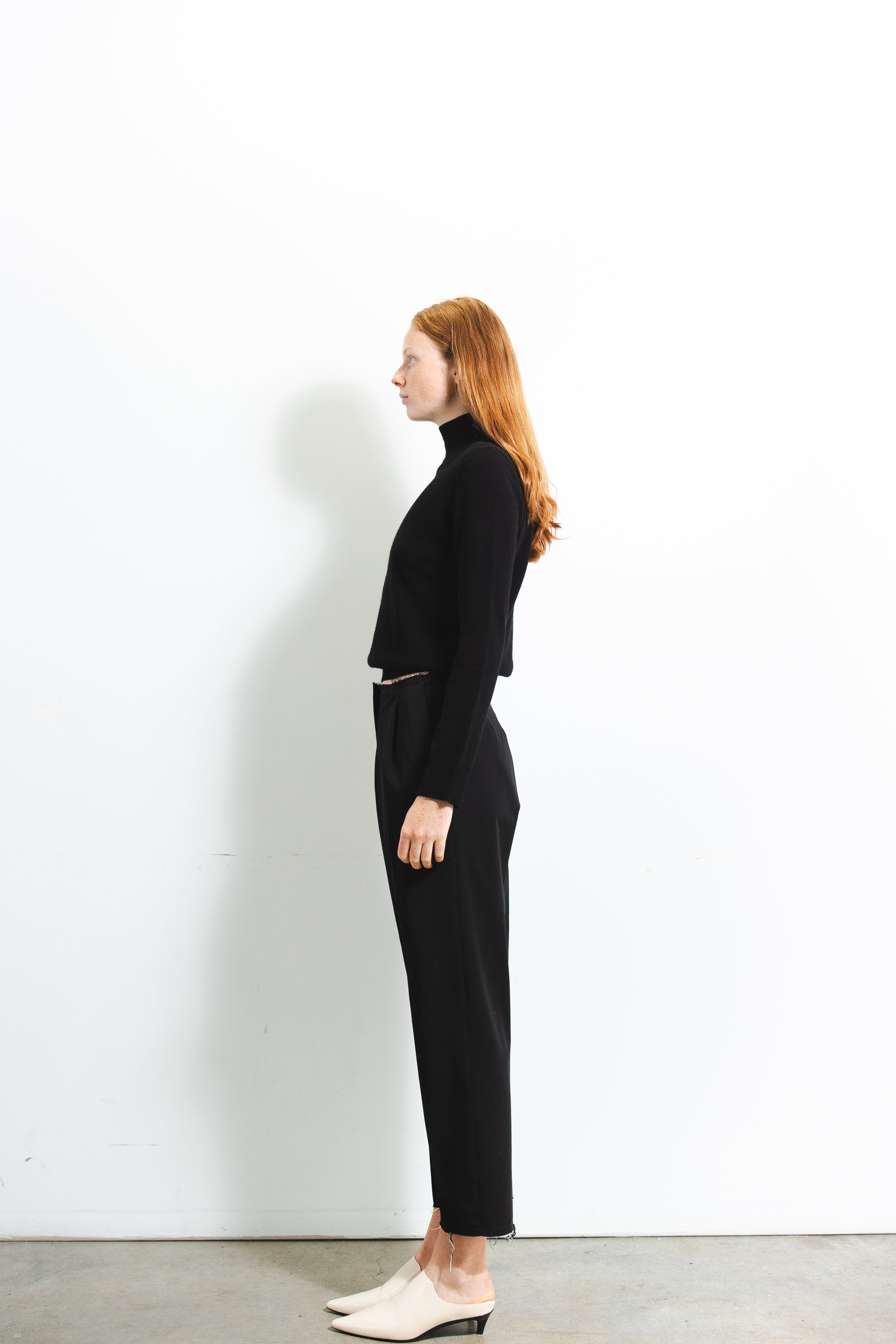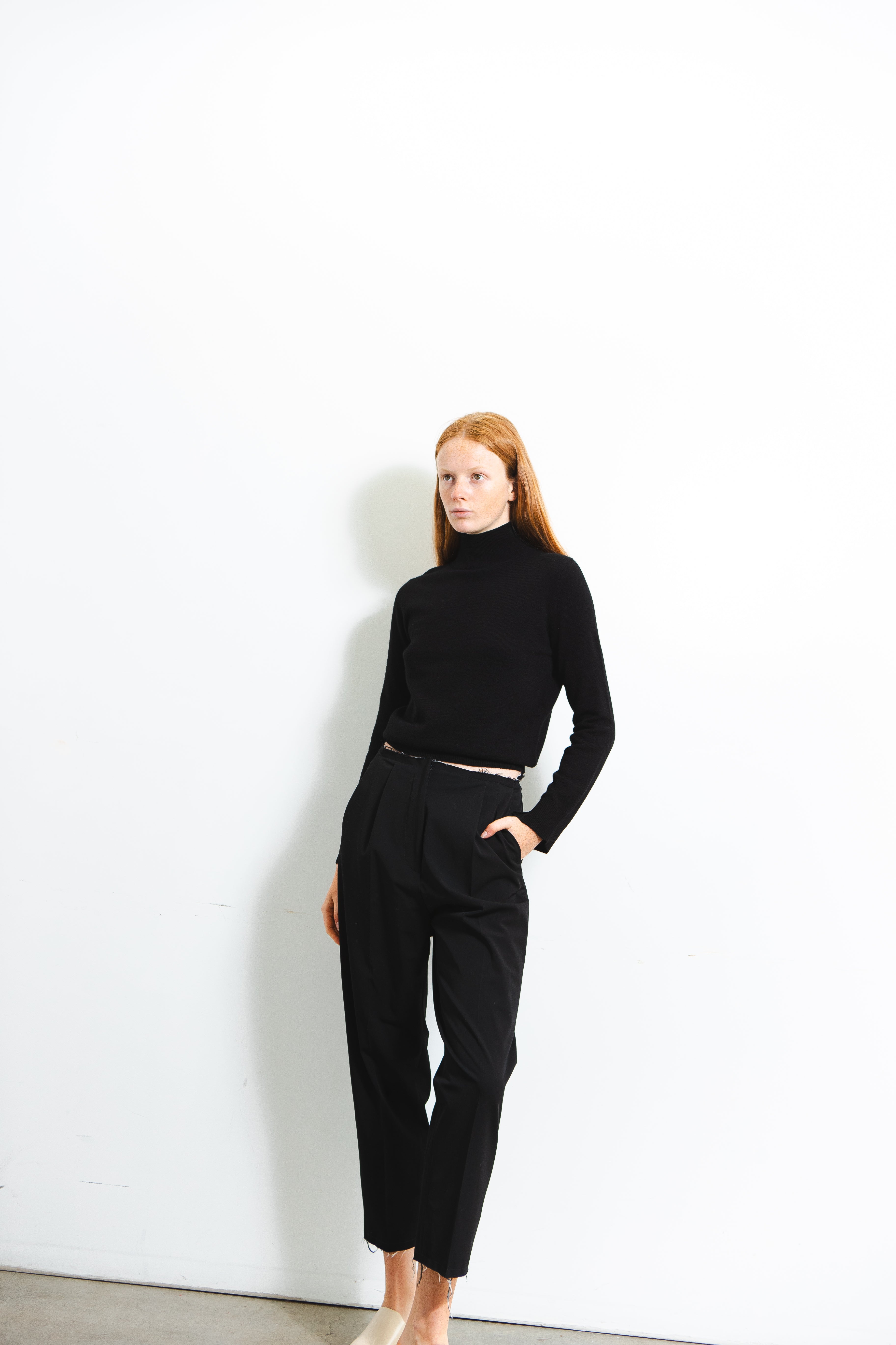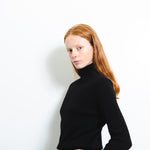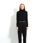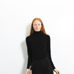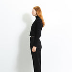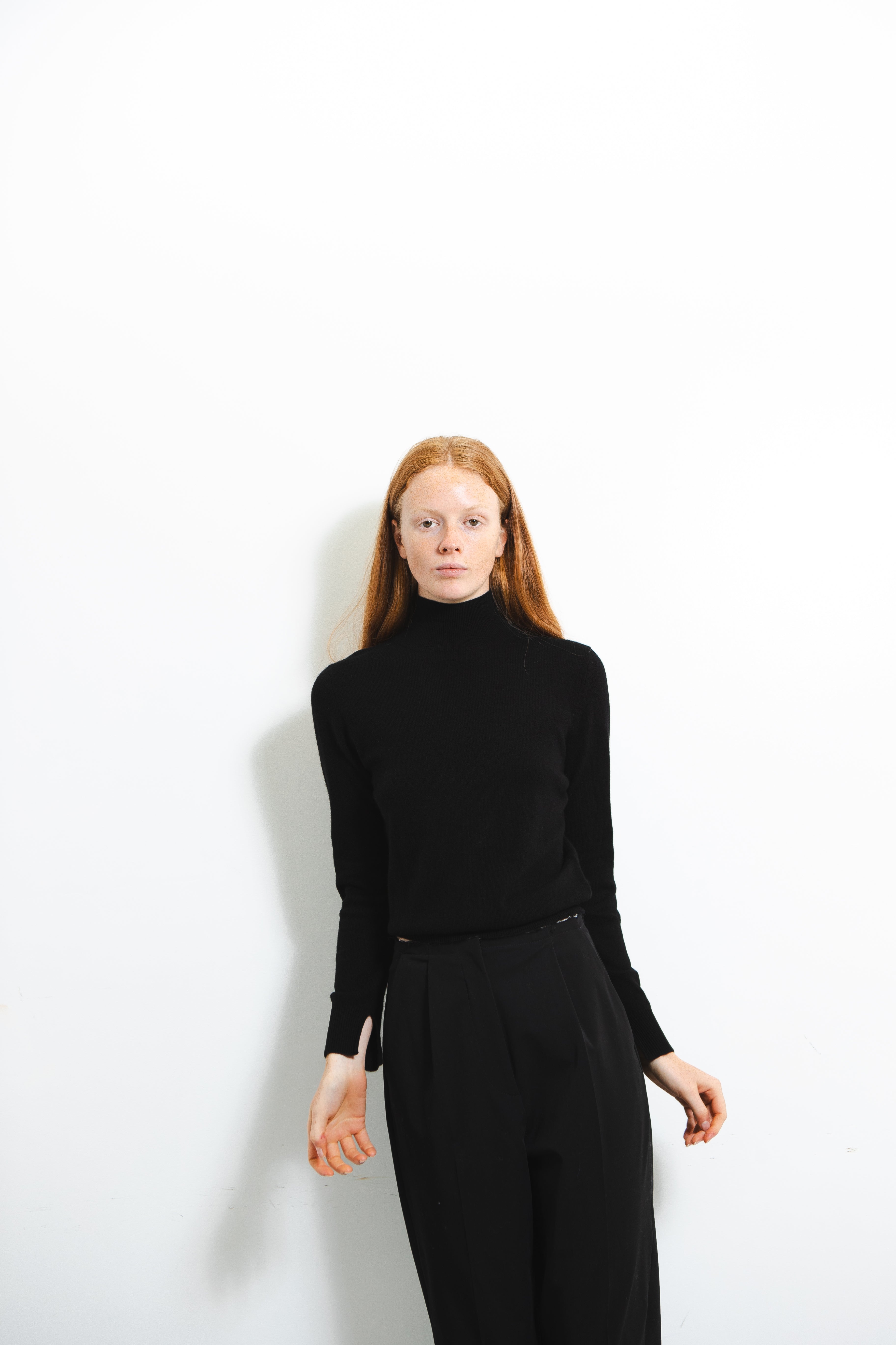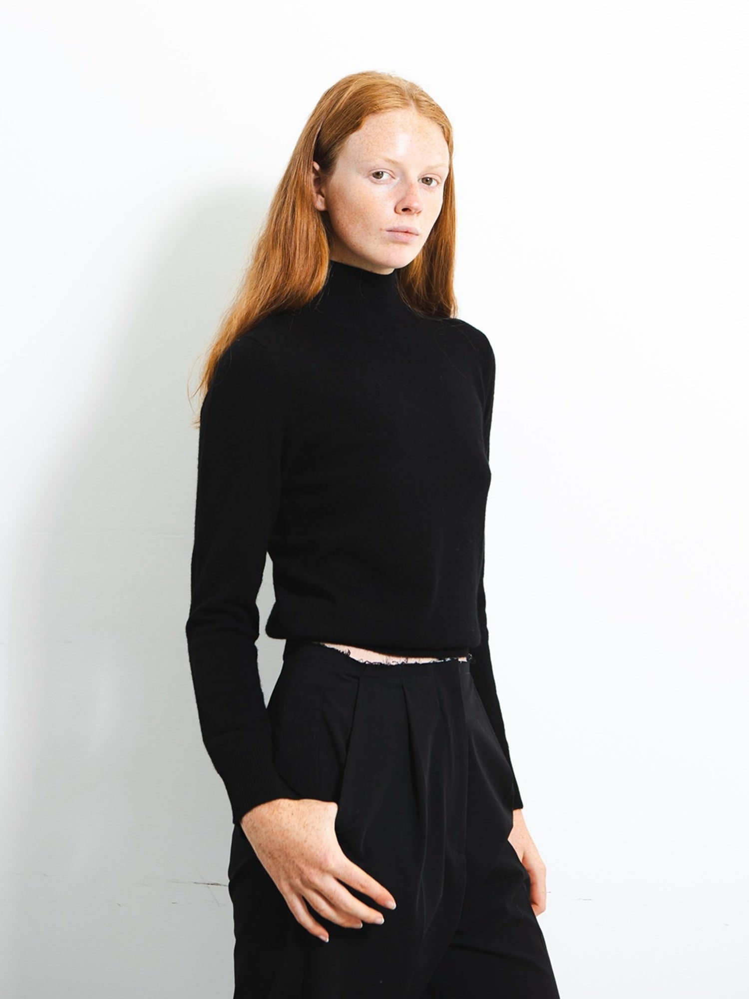 A decent length of the mock neck designed sweater is easy to coordinate with any items. It's a proper item for the layering inner cloth because it's been made with 100% Mongolian Cashmere that provide softness fit. Thin but tightly woven mock neck wrap around with comfiness and it gives feminal feeling by adding split cuffs. It's a highly useful daily item which can create wide range of styles in fall as well as winter.