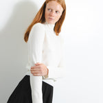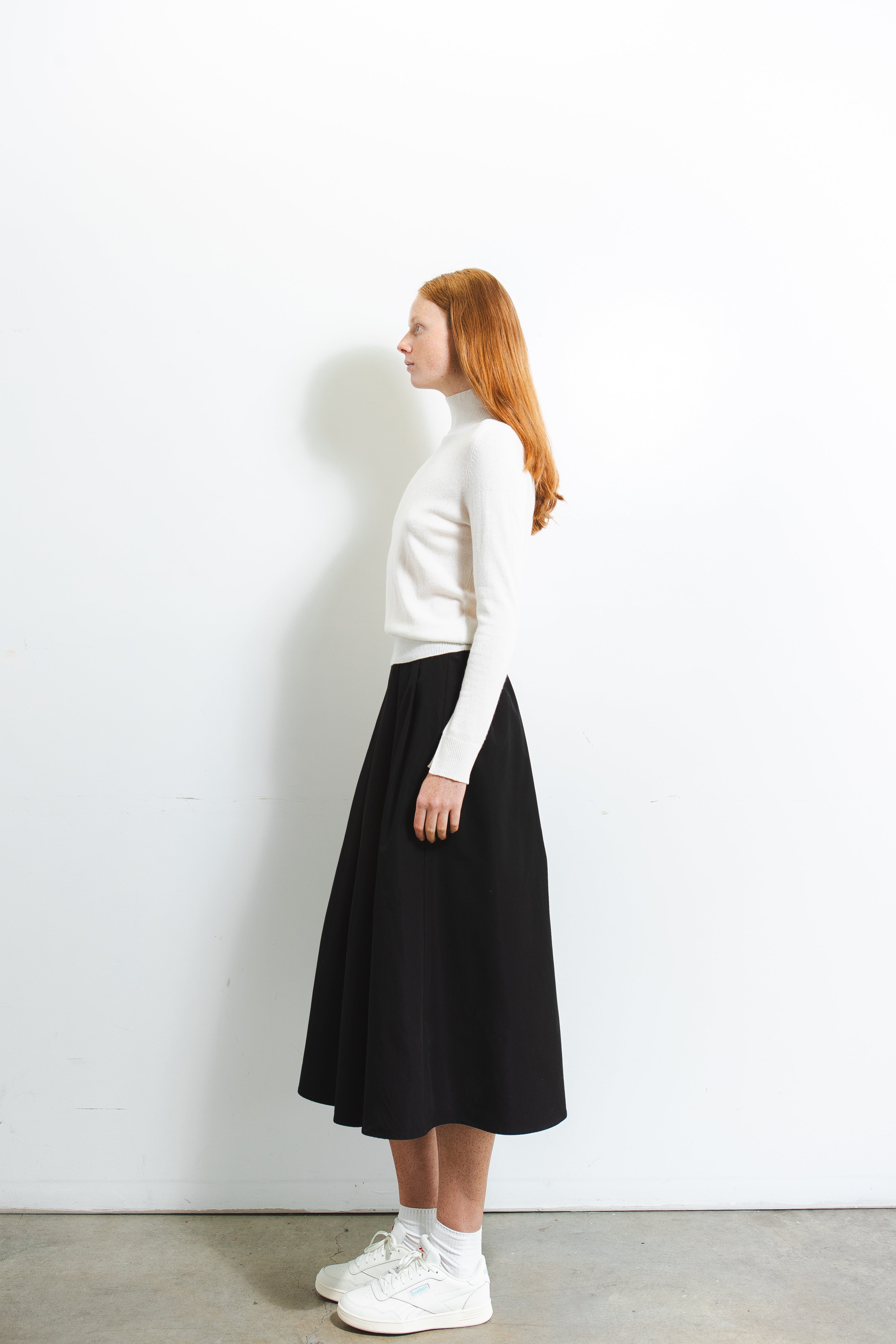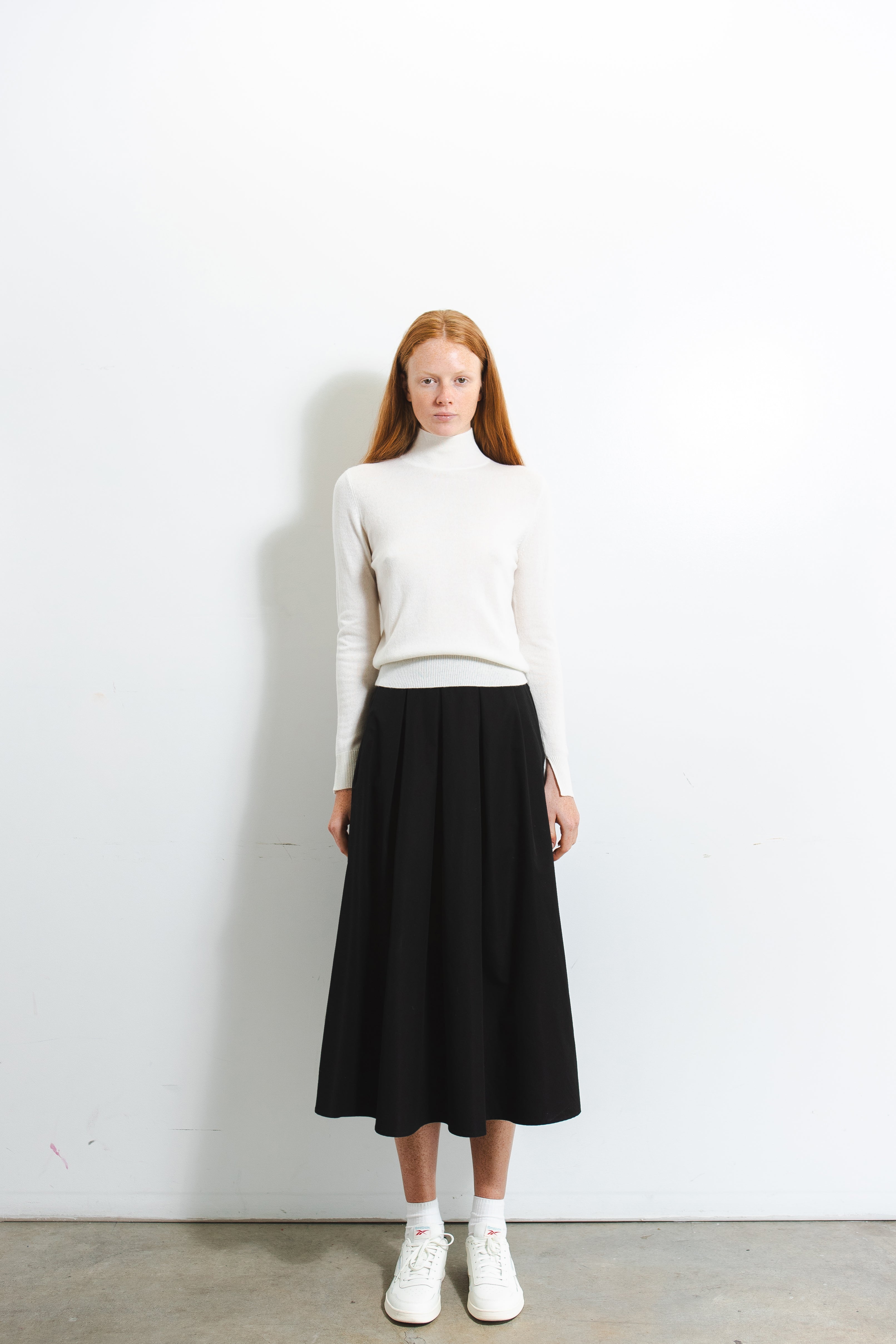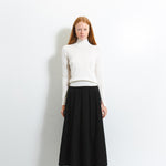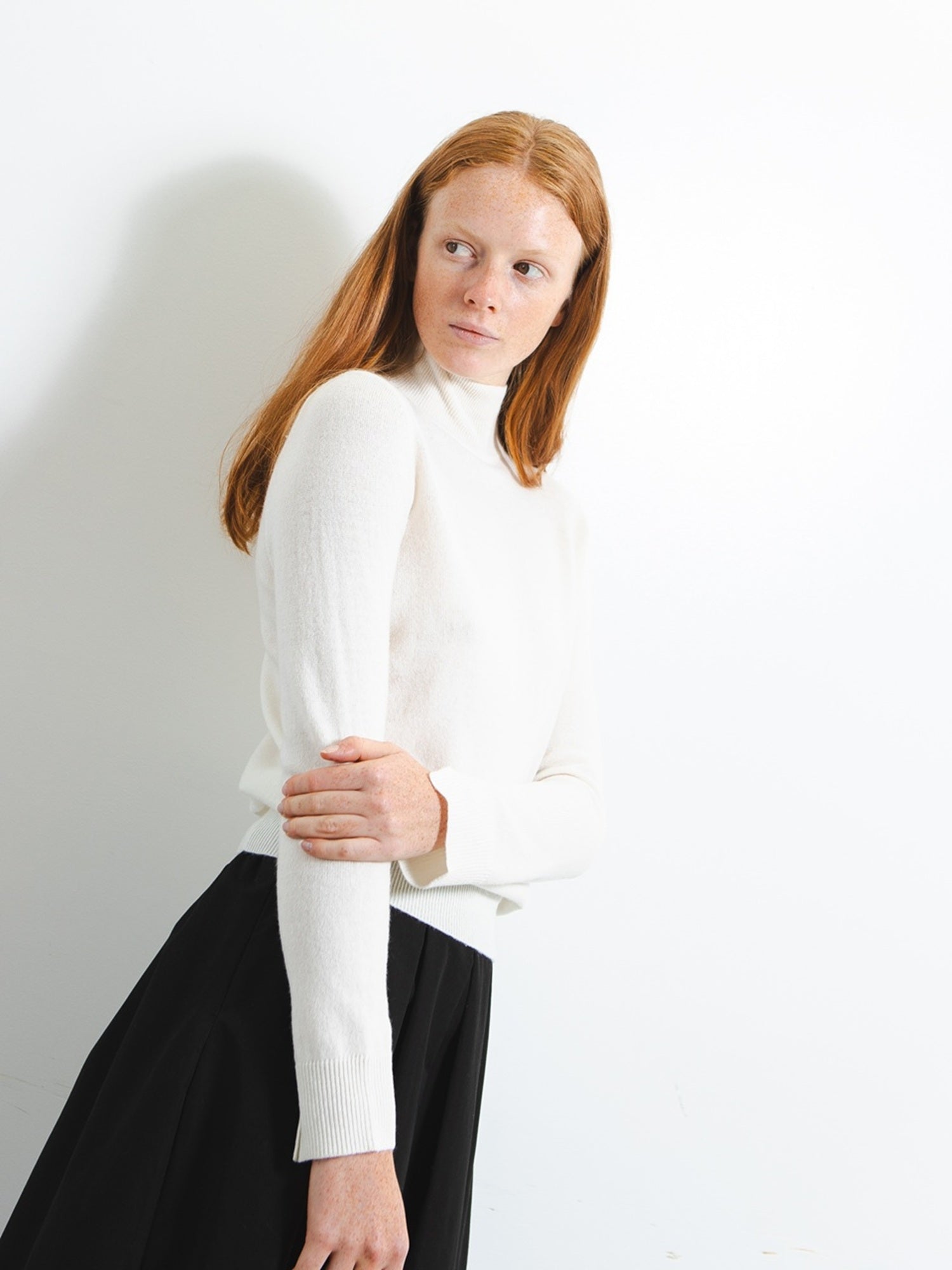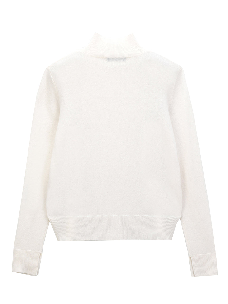 A decent length of the mock neck designed sweater is easy to coordinate with any items. It's a proper item for the layering inner cloth because it's been made with 100% Mongolian Cashmere that provide softness fit. Thin but tightly woven mock neck wrap around with comfiness and it gives feminal feeling by adding split cuffs. It's a highly useful daily item which can create wide range of styles in fall as well as winter.